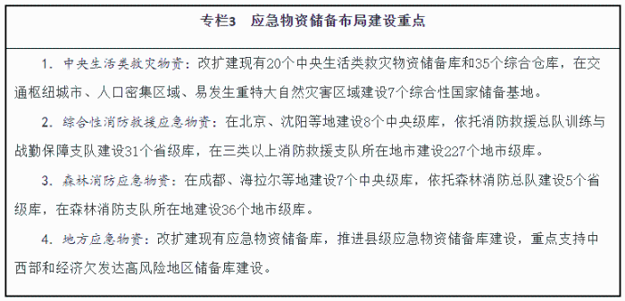 充分利用仓储资源,依托现有中央和地方物资储备库,建设综合应急物资储备库。在交通枢纽城市、人口密集区域、易发生重特大自然灾害区域建设一批综合性国家储备基地。建设完善国家综合性消防救援队伍应急物资储备库及战勤保障站。在关键物流枢纽建设应急物资调运平台和区域配送中心,依托大型快递物流企业建设一批综合应急物资物流基地。完善国家应急资源管理平台和应急物资保障数据库,汇聚应急物资信息。