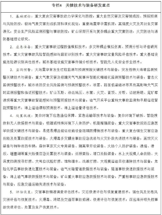 建设重大自然灾害风险综合防范、重特大生产安全事故防控、复合链生灾害事故防治、城市安全与应急、矿山重大灾害治理、防汛抗旱应急技术、应急医学救援等国家级实验室和部级实验室。建设地震科学实验场和地震动力学国家重点实验室。实施大灾巨灾情景构建工程。建设火灾防治、消防救援装备、防汛抗旱和气象灾害防治、应急救援机器人检测、无人机实战验证、应急通信和应急装备物联网、大型石油储罐火灾抢险救援、城市跨类灾害事故防控、煤矿深部开采与冲击地压防治、高瓦斯及突出煤矿灾害防治等研究基地。依托现有机构完善危险化学品安全研究支撑平台。优化自然灾害领域国家野外科学观测研究站布局。建设应急管理领域国家科技资源共享服务平台和重点灾害地区综合防灾减灾技术支撑平台。完善区域地球表层、巨灾孕育发生机理等模拟系统和国际灾害信息管理平台。