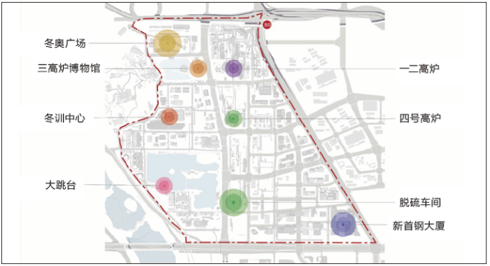 它们分别位于是供、储料区的冬奥广场,位于炼铁区的三高炉博物馆,位于储煤制粉区的冬训中心和冰球馆,以及位于自备电厂区且毗邻冷却塔的单板滑雪大跳台。