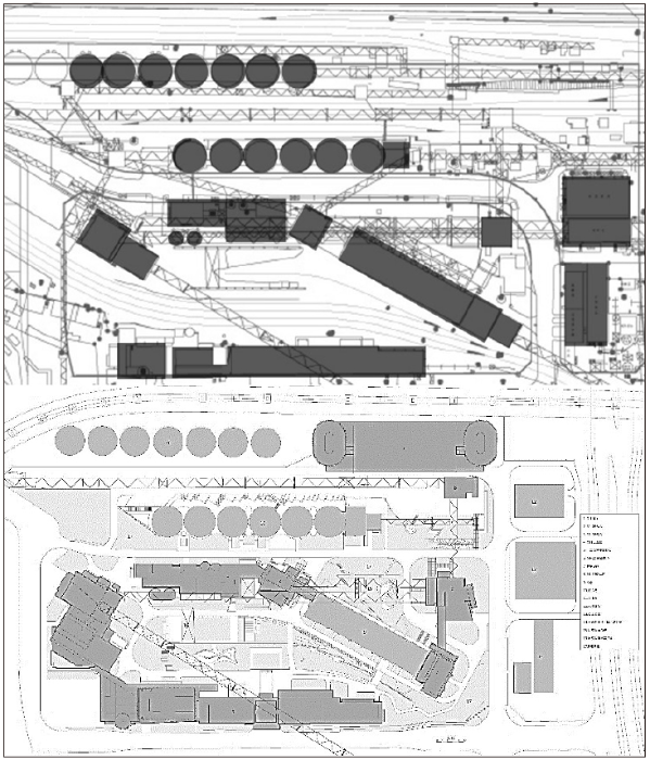 该基地的名称来源于地块北侧原京奉铁路西十货运支线。基地内主要有园区一号、三号高炉炼铁厂的储料、供料区,储料区原有南六筒和北十筒,因修建 S1 号低速磁浮线,拆除了西北侧的三筒,留存南六筒和北七筒;供料区因修建通往小西门的支路,拆除了三号高炉料仓,留存一号高炉料仓,N3-3、N3-2、N3-17、N1-2 转运站四座;还留存了为一、三高炉循环冷却水提供动力的联合泵站及配套锅炉房水塔一座、主控室一座、返矿仓一座、空压机房一座,以及干法除尘器及压产发电控制室一座(图 5)。