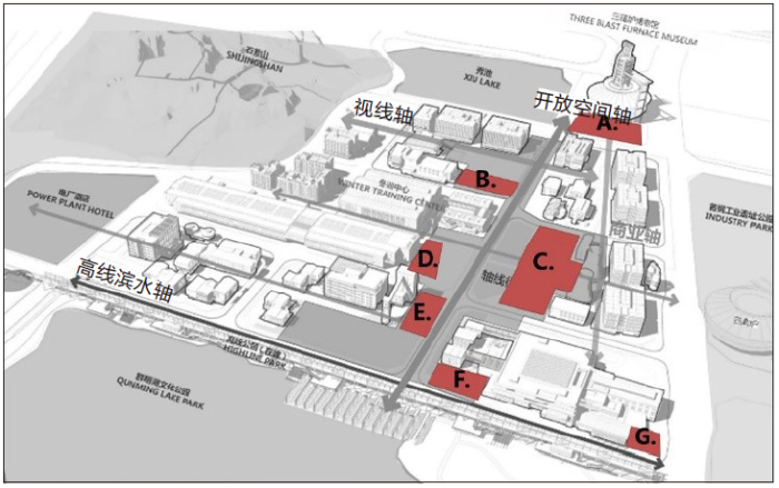 针对北区保留的大量工业遗存,城市设计提出了“点面结合”的整体策略,既对炼铁工艺进行整体面状保存,又选择了四个核心锚点项目来进行“都市针灸”,以突出工艺群核心建筑。