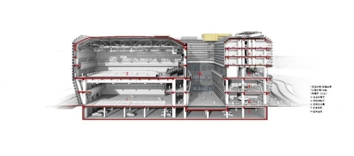 在最终呈现的“冰坛”之中,设置了专业竞技在东在上,公众开放在西在底的两套空间体系,两者之间通过可以采光通风的露天内院缓冲,根据开放情况的不同灵活控制。