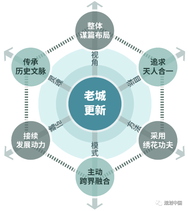 基于上述判断,作者探索性地构建老城更新的系统路径,包括整体谋篇布局(视角)、追求天人合一(目标)、采用绣花功夫(方法)、传承历史文脉(灵魂)、主动跨界融合(模式)、接续发展动力(引擎)。