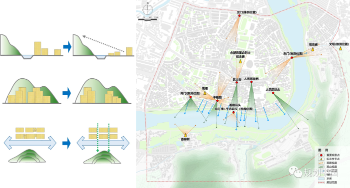 二是修复山—水—城良好空间秩序。如何将城市融入绿水青山是新时代城市更新需要重点关注的议题。永新老城更新规划中提出强化山水生态屏障,严格控制周边建设强度和形态;疏浚历史水系,修复自然驳岸、湿地、滩涂等,营造连贯的亲水空间,再现渡口、码头、浮桥、阁塔等历史景观意向。