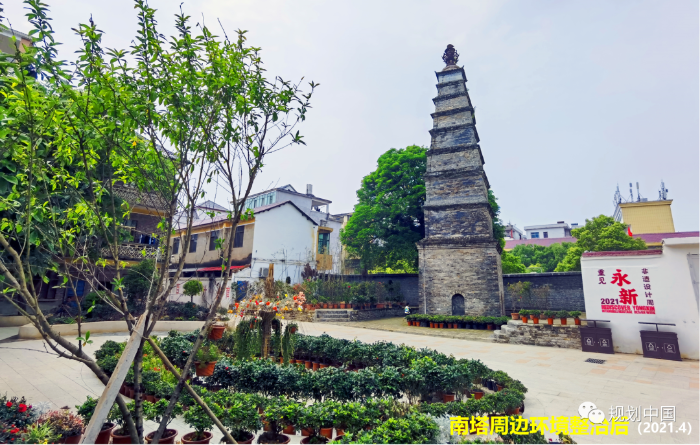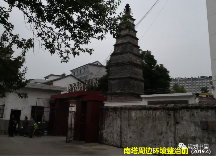 精心保护和修缮南塔、红四军军部旧址等体现不同时期、不同文化的建构筑物。以用促保,让各类遗产在有效使用中成为老城的特色标识和历史记忆,让历史文化和现代生活融为一体。例如,位于老城南部的南塔建于北宋至道元年(995年),通高17m,青砖叠砌,是老城的重要历史地标,对展示老城传统格局具有重要价值。但是,南塔长期位于中学围墙内,未得到良好的保护与展示。更新规划与景观设计中提出打开学校及对面办公楼围墙,改善南塔的历史环境,取得显著成效。