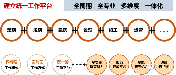 当前,城市规划建设在学科细分的背景下形成了单一流线式作业流程——规划完成后,建筑设计、景观设计和施工图设计逐级落实,但由于学科背景、工作深度和思维方式的差异,建筑、景观方案往往对规划进行修改,施工阶段,建筑、景观方案又会被改的面目全非,各专业之间的隔阂导致城市建设效果大打折扣。