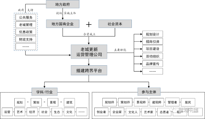 新时代的老城更新工作量大面广、千头万绪,面临的社会背景、主要问题和目标与过去截然不同,当前的学科各自埋头工作和单一流线组织方式很难适应城市更新的需求,亟待探索新的研究体系和工作组织模式。这就需要充分借鉴中国传统的营城思想,以规划、建筑、景观等专业为主导,主动“跨界融合”,整合更多的相关专业,搭建集规划、设计、经济、文化、艺术、策划、运营、社会学等多学科为一体的研究实践平台,利用群体智慧进行协同创新,为老城更新和发展提供有创意的、系统性方案。