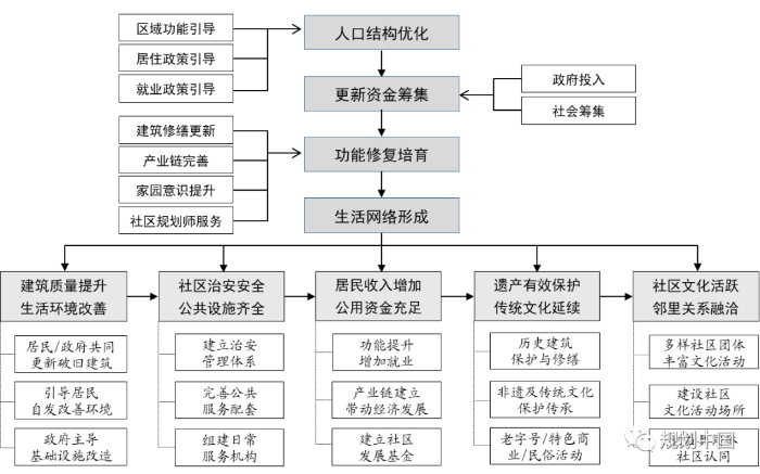 更新规划建议政府的工作重点聚焦于老城的公共环境、基础设施提升,改善老城破旧的面貌以提振居民信心,并制定相应的政策吸引原有人口返流和外来人口定居。例如,政府提供相应的财政补贴,鼓励居民及外来人口参与社区自主更新,并积极与第三方NGO或专家团体合作,制定行动计划,促进老城可持续发展。同时老城内社区建立非盈利性质的运营机构,由政府派驻人员、社区居民代表、社区规划师等相关人员组成,负责社区日常工作,使政府、市场、居民等相关主体共同参与社区管理。
