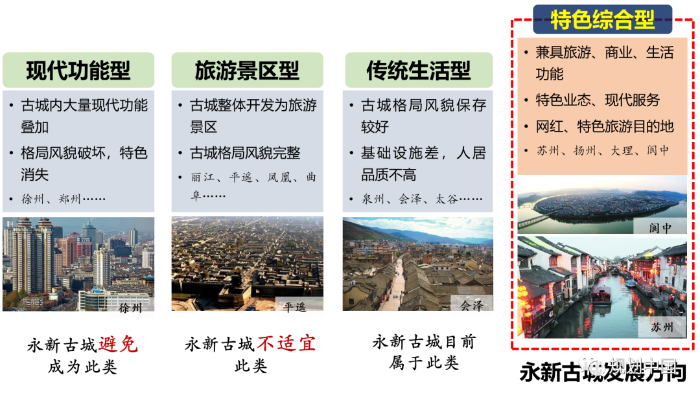作者对中国多个老城的功能特征和发展路径进行了比较分析。研究认为,永新古城应定位为特色综合型古城,改善为居民生活服务的公共设施和基础设施,通过城市更新不断优化提升功能配套,因地制宜地培育文化特色类产业,老城逐步发展成为集居住、文化、旅游、商业于一体的城市特色区域。