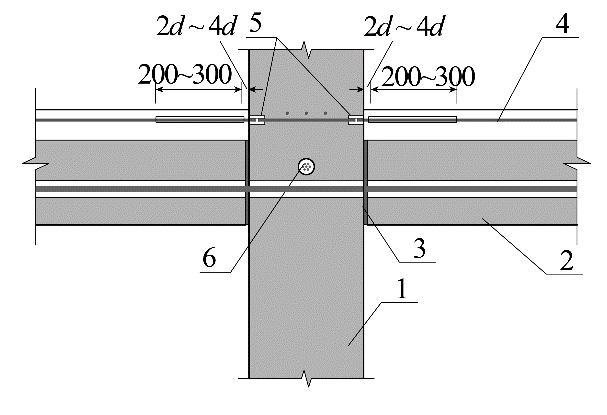 1—预制柱;2—预制梁;3—纤维高强灌浆料灌缝;4—耗能钢筋;5—钢筋连接器;6—垂直方向预应力钢绞线