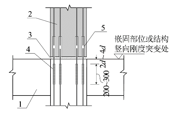 1—梁;2—预制柱;3—柱端接缝;4—耗能钢筋削弱无粘结段;5—钢筋套筒灌浆连接