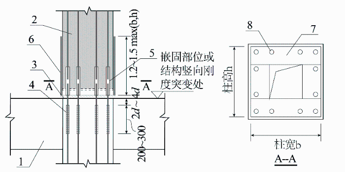 1—梁;2—预制柱;3—柱端接缝;4—耗能钢筋削弱无粘结段;5—钢筋套筒灌浆连接;6—外包钢板;7—加劲板;8—套筒定位孔