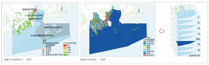 珠海市是国家生态文明建设示范市和国家森林城市,自然资源禀赋明显,拥有集山、水、林、田、湖、海、岛、湾等于一体的自然资源要素本底。同时,珠海市位于粤港澳大湾区生态环与磨刀门生态廊道交汇处、“东亚—澳大利亚”候鸟迁徙路线中端位置及珠三角水鸟廊道交汇处,是粤港澳大湾区生态环及沿海生态走廊的重要节点,生物多样性非常丰富。面向全域全要素和生物多样性的自然资源本底调查,是珠海市实现国土空间生态整体保护、系统修复和综合治理的基础工作。以第三次国土调查成果为统一底板,利用高分辨率遥感影像解译、生物多样性实地调查等手段,对珠海市全域全要素及生物多样性进行调查和系统评价,并以特色物种水鸟作为指示物种评价珠海市的生境适宜性,建立珠海市国土空间自然资源调查评价“一张图”及其资源数据库,包括珠海市自然要素“一张图”和珠海市生物多样性“一张图”( 图2)。