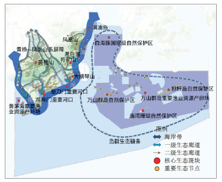 珠海市国土空间生态安全格局主要由东部的海洋海岛板块、西部的大陆板块组成,在陆海交接处形成了典型的海岸带,不仅构成珠海市生态安全格局中生态的关键组成部分,还是珠海市国土空间生态修复规划的重点区域。珠海市拥有漫长的海岸带,其陆海交互作用形成了丰富的生物多样性,同时也是国际八大候鸟迁徙路线之一的“东亚—澳大利亚”路线中的重要路段,拥有多个重要湿地及珠江水系八大入海口门中的五大口门。海洋海岛板块主要以珠江口中华白海豚国家级自然保护区、万山群岛自然保护区、庙湾珊瑚自然保护区、担杆岛及周边海域自然保护区为本底,串联桂山、东澳、外伶仃、庙湾和担杆五大岛群。大陆板块主要包括广东省区域绿廊—由黄杨—凤凰山系构成的山体生态屏障,以磨刀门水道、黄杨河—鸡啼门道、虎跳门水道为主的河流水系廊道,以及以城市绿道为主体的绿地廊道和由乡村田园水网、城镇生态社区构成的生态网络。