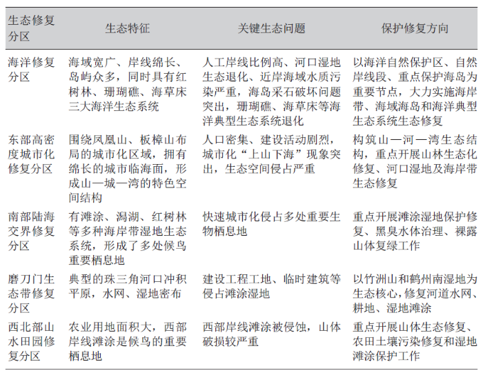表1 珠海市域生态修复分区与修复方向