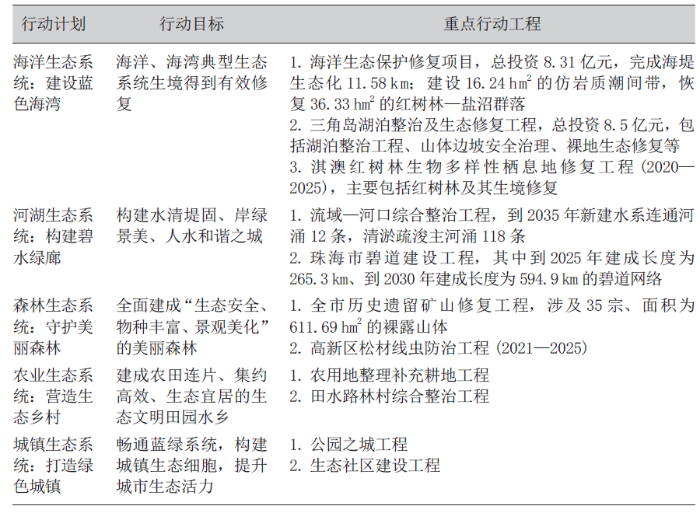 规划通过制定面向实施的五大生态系统修复行动计划和重点行动工程(表2),明确行动目标,衔接重点行动工程,以统筹珠海市海洋、河湖、森林、农业和城镇五大空间的系统修复,全面推进珠海市山、水、林、田、湖、海、城全要素的系统修复,不断筑牢珠海市陆海生态安全格局和基底,全面提升自然资源承载力和城乡空间品质。