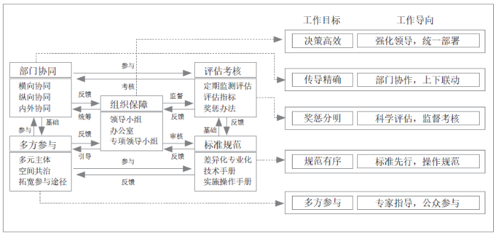 为贯彻自然资源部门“两统一”职责,系统统筹推动生态修复实施落地,珠海市国土空间生态修复规划专门开展了规划实施机制的专题研究,面向决策高效、传导精确、奖惩分明、规范有序和多方参与的工作目标,构建了“组织保障—部门协同—评估考核—标准规范—多方参与”的珠海市国土空间生态修复规划实施机制:一是建立以自然资源部门为主导的组织管理制度,以强化领导和统一部署为工作导向,建立多部门整治协调机构和统筹推进机制;二是以部门协作和上下联动为导向,构建横向协同、纵向协同与内外协同相结合的部门协同和传导机制;三是建立权责明确的监督评估考核制度,旨在建立项目进展台账和责任制,开展生态修复效果评价,创新监测监管机制;四是构建分类标准规范体系,通过制定差异化、合理化的修复标准和科学化、专业化的操作规范,明确工程技术与规划设计指导和项目实施流程管理,指导生态修复项目实施操作;五是逐渐将生态修复由政府主导转变为多方参与模式,进一步调动科研机构、企业、非政府组织、社会公众的多元主体参与(图6)。