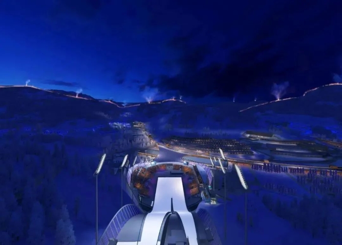 ▲从国家跳台滑雪中心“雪如意”远眺长城夜景效果图