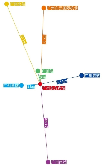广州东方宾馆:距离广州火车站约2km,距离广州东站约9.5km,距离广州南站约24km,距离广州西站约4km,距离广州北站约35km,距离广州白云国际机场约33km。