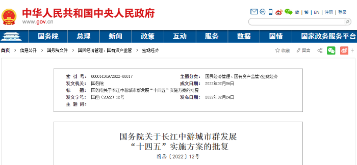 2月24日,中国政府网发布《国务院关于长江中游城市群发展 " 十四五 " 实施方案的批复》,原则同意《长江中游城市群发展 " 十四五 " 实施方案》。