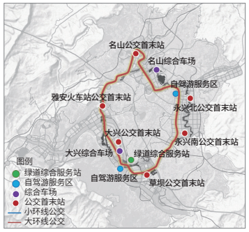 规划建立市级—区县级—组团级客运枢纽,综合多种交通系统,实现综合枢纽的无缝换乘。其中,市级客运枢纽包括雅安客运站和名山客运站,集合了铁路、长途客运、公交和慢行交通系统;区县级客运枢纽包括各县长途客运站和城区内两个公交枢纽站;组团级客运枢纽为组团内的公交首末站,围绕首末站提供充足的慢行设施。