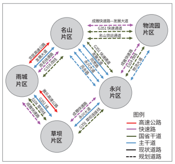 雅安市水系密集,地质活动活跃,各种灾害频发,需要建设韧性交通系统。《城市综合交通体系规划标准》(GB/T 51328—2018)规定,“7度地震设防的城市每个疏散方向应有不少于2条对外放射的城市道路”。由于雅安市为组团式布局城市,组团间比较分散孤立,为加强组团间的交通连接,规划在组团间建设不少于3条干线道路,增强组团间的交通连接,以方便市民的跨区出行,提高交通系统韧性(图4)。