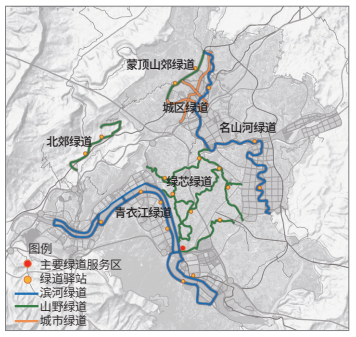 规划配套建设多类型绿道,为人们提供丰富的骑行体验。规划结合青衣江和名山河建设滨河绿道;结合绿芯、蒙顶山和北郊设置山野绿道;结合名山城区配置城市绿道。沿绿道设置绿道服务区和绿道驿站,配套设置骑游设备租售、维修、休憩、医疗保障和游客服务等功能。规划多个绿道与城市道路的接口,方便市民进入绿道开展休闲活动(图5)。
