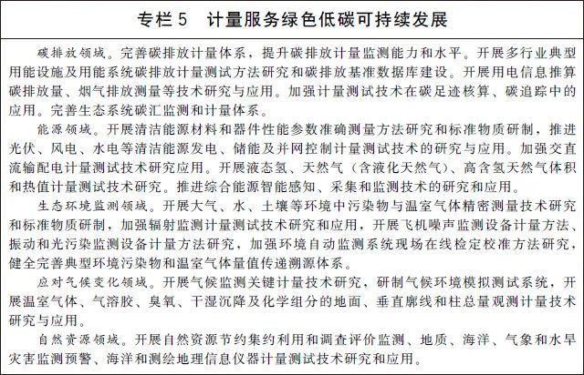 (十四)支撑碳达峰碳中和目标实现。完善温室气体排放计量监测体系,加强碳排放关键计量测试技术研究和应用,健全碳计量标准装置,为温室气体排放可测量、可报告、可核查提供计量支撑。建立碳排放计量审查制度,强化重点排放单位的碳计量要求。在城市和园区开展低碳计量试点。建立完善资源环境计量体系,建设一批国家能源、水文水资源和环境计量中心,推进能耗、水资源、环境监测系统建设,加强能源资源和环境计量数据分析挖掘和利用。加快推进能源资源计量服务示范工程建设,引导和培育能源资源和环境计量服务市场。
