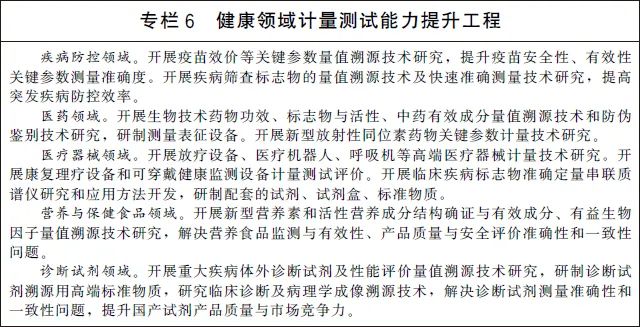 (十五)服务大众健康与安全。加快医疗健康领域计量服务体系建设,围绕疾病防控、生物医药、诊断试剂、高端医疗器械、康复理疗设备、可穿戴设备、营养与保健食品等开展关键计量测试技术研究和应用。加强体育设施和器材计量技术研究和测试服务,促进体育产业高质量发展。完善地质和海洋灾害、地震、洪涝干旱、森林草原火灾等自然灾害防御的计量保障体系,提高防灾、减灾、救灾计量能力。加强危险化学品、矿山、建筑施工、地质勘查等安全生产相关计量器具的研制生产和监督管理。加强公共安全领域计量服务体系建设,开展交通安全、社会稳定和安全等领域关键计量测试技术研究和应用,推进交通监管设备、警用装备、刑事技术产品等计量测试基础设施建设。