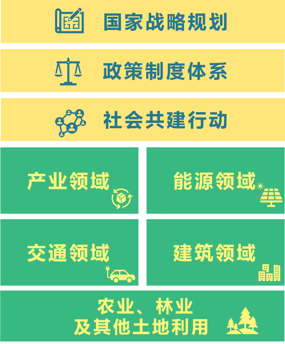 为助力实现碳中和愿景,梳理了近年来我国积极应对气候变化的相关政策,涵盖国家战略规划、政策制度体系和社会共建行动等重要指导文件,以及产业、能源、交通、建筑和土地利用五大重点领域协同政策。