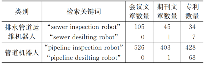 本文同时计量了管道机器人(石油、燃气等管道)的研究现状,意图通过对比确定排水管道机器人的研究广度与先进性。相较管道机器人,城市排水管道机器人研究起步晚,范围小。相关研究团队缺乏持续、深入地研究,团队间交流合作较少。数据表示排水管道机器人的研究存在不足,亦说明目前排水管道机器人的研究有较好的发展前景。