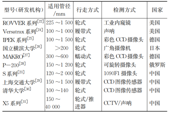 表2展示了国内外典型检测机器人的型号、参数,面向多管径、多管况的检测机器人已经提出,技术体系逐渐成熟。