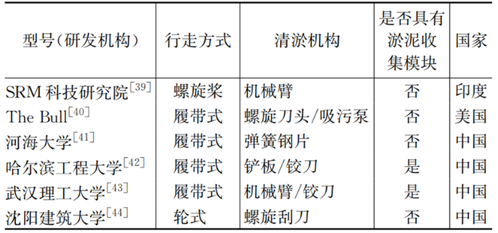 表3列举了国内外部分管道清淤机器人,介绍了清淤机器人模块设计方案。目前清淤机器人的研究多而不精,机构设计较检测机器人均较为普通;部分方案仍处于概念设计阶段,清淤能力难以表征。