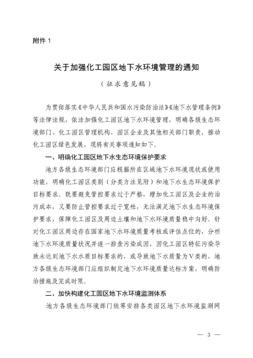 附件:1.关于加强化工园区地下水环境管理的通知(征求意见稿)