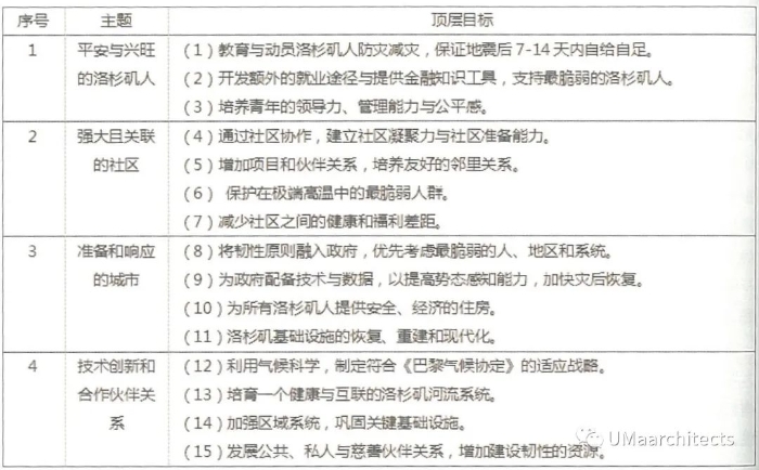 该韧性战略为洛杉矶构建了一套完整、具有可操作性的目标体系,包含:4大主题、15个顶层目标、96项行动计划,使其成为一个全球韧性模型。