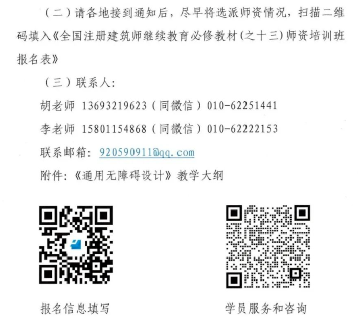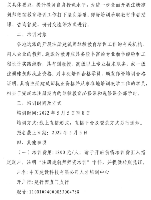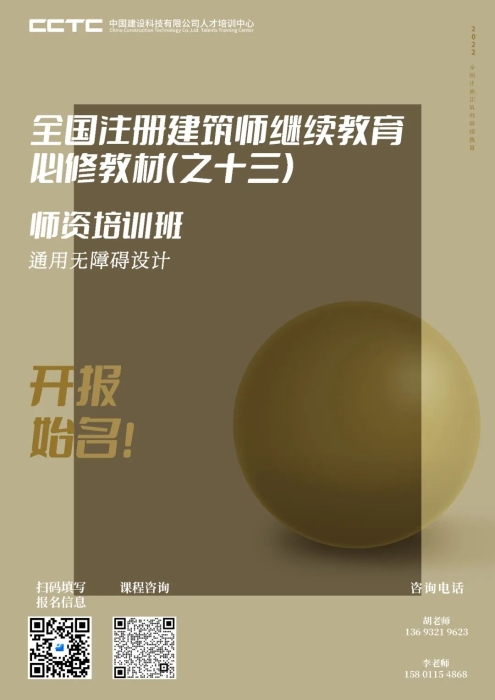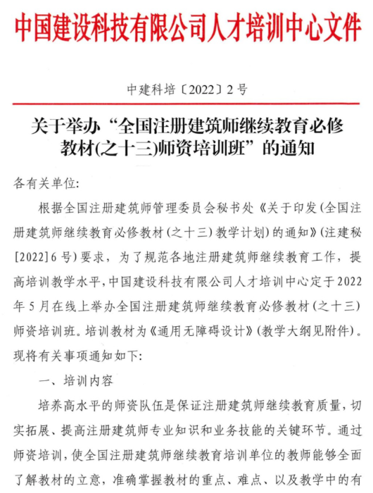 根据全国注册建筑师管理委员会秘书处《关于印发 (全国注册建筑师继续教育必修教材 (之十三)教学计划)的通知》(注建秘[2022]6号)要求,为了规范各地注册建筑师继续教育工作,提高培训教学水平,中国建设科技有限公司人才培训中心定于2022年5月在线上举办全国注册建筑师继续教育必修教材(之十三)师资培训班。培训教材为《通用无障碍设计》(教学大纲见下文)。