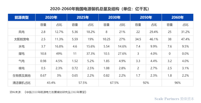 其次讨论“技术固碳”:尽管美国等国将其作为碳中和的主要路径,但技术固碳目前经济成本高昂。另一方面,技术固碳的“碳成本”也很高:制造、运输碳捕捉相关设备、碳捕捉设备工作都是需要消耗能源、产生碳排放的。因此,在技术固碳能够被大规模、低成本和低碳排放地应用之前,技术固碳无法成为实现碳中和所主要仰仗的手段。2021年10月发布的《中共中央国务院关于完整准确全面贯彻新发展理念做好碳达峰碳中和工作的意见》提出:到2025年,全国化石能源消费比重,要降低到80%左右;到2030年,降到75%左右;到了2060年,比重要降低到20%以下。另外根据《中国2030年能源电力发展规划研究及2060年展望》中对各类型能源装机量的占比规划,我们进一步确认了中国选择了以“减少碳排放”为主,“增加碳吸收”为辅的路径。