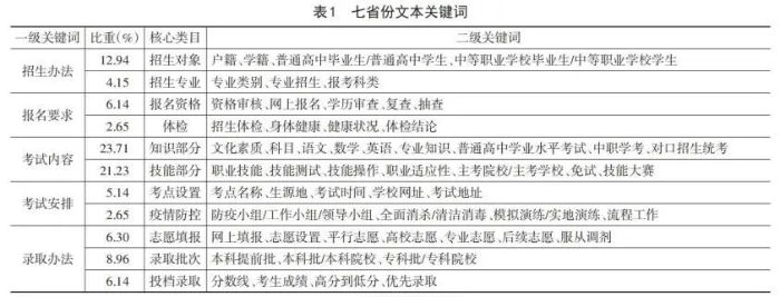《国家职业教育改革实施方案》指出招生对象要进一步扩大到退役军人、下岗失业人员、农民工和新型职业农民等群体。根据该条,七省均根据自身情况对“招生对象”做出范围限定。通过对关键词的统计分析,在“核心类目”所占比重排名中,“招生对象”所占比重仅次于“考试内容”中的“知识部分”和“技能部分”。可见在政策中,“招生对象”为各省政策制定的重点之一。