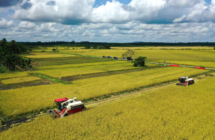 2022年5月21日,收割机在海南省海口市红旗镇墨桥村的稻田作业(无人机照片)。新华社记者 郭 程 摄