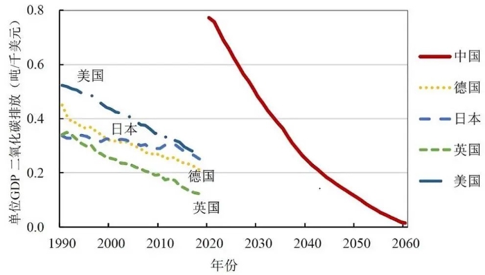 图4 中国与主要发达国家单位GDP二氧化碳排放量对比(2015年不变价)