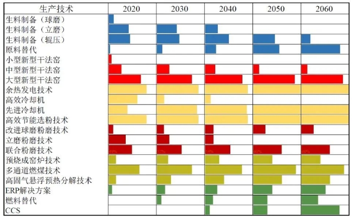 水泥行业相应的技术布局如图11所示。熟料煅烧环节是水泥行业CO2排放产生的主要环节,需加快淘汰落后产能,推广先进技术。具体来说,小型新型干法窑等高耗能技术需在2030年前逐渐被淘汰,中型和大型干法窑等技术需进行节能改造升级或效率提升,分别加装高固气悬浮预热分解和多通道燃煤技术,到2060年争取达到60%和90%的改造率。在熟料煅烧过程中,需充分利用预处理技术和能源二次循环使用技术,如预烧成窑炉技术和余热发电技术,这些技术的占比应逐年增加,到2060年,预烧成窑炉技术和余热发电技术的占比分别达到40%和90%以上。除推广节能减排技术外,原料替代和燃料替代等深度减排措施也需要发挥重要作用,力争到2060年分别达到80%和35%以上的替代程度。CCUS技术在2030年后开始规模应用,逐渐增大其应用程度,到2060年增至80%以上。加速推广ERP(Enterprise Resource Planning,企业资源计划)解决方案,到2060年争取实现50%以上的普及。