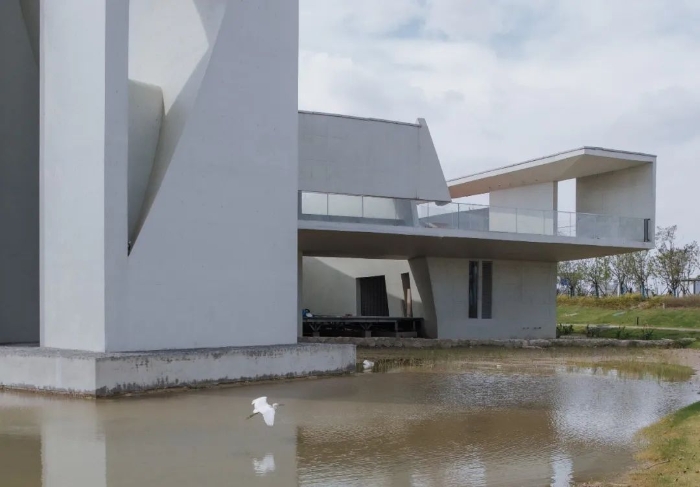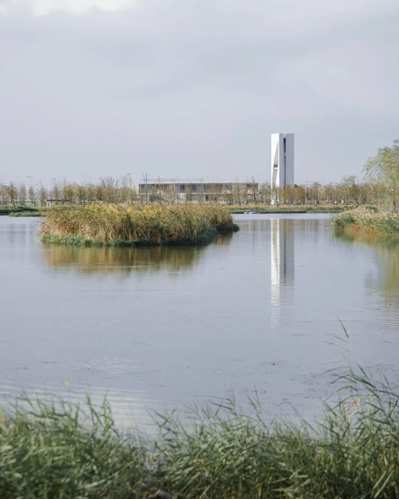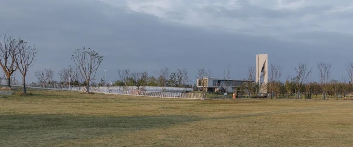 上海临港“星空之镜”公园有两个主题:海绵城市生态技术与天文观测。本项目位于B区,公园唯一的一处湿地北岸,一套三件——驿站、塔和桥。驿站取名“同观廊”,意在观星、观鸟、观湿地,同观共享;塔名“旋星”,是公园里唯一的制高点。桥名“羽旋”,意求鸟羽般轻巧。