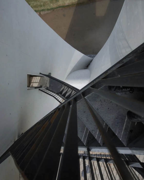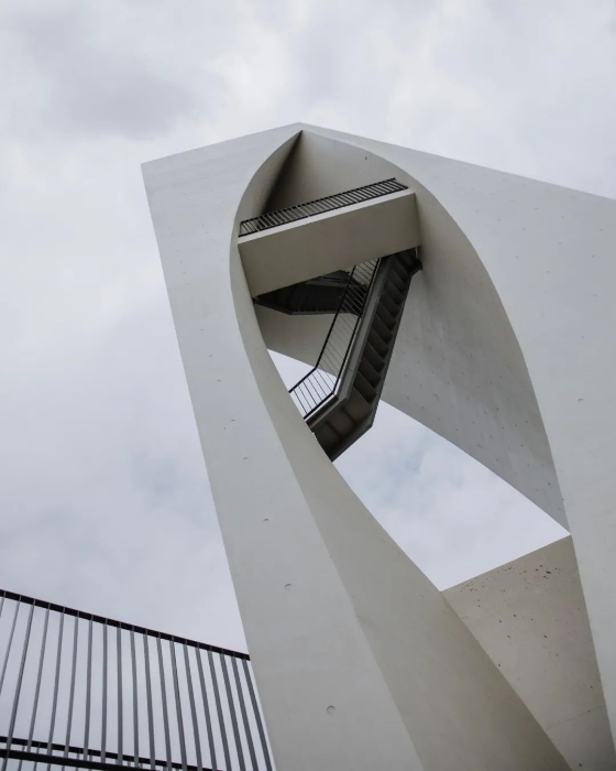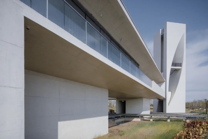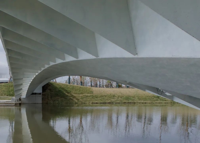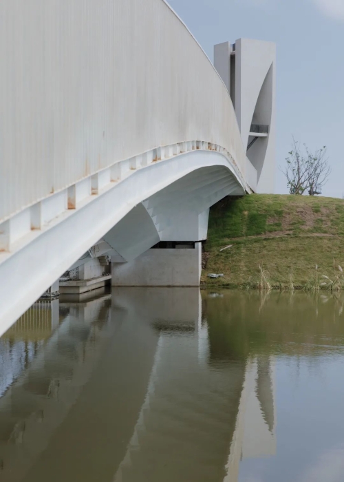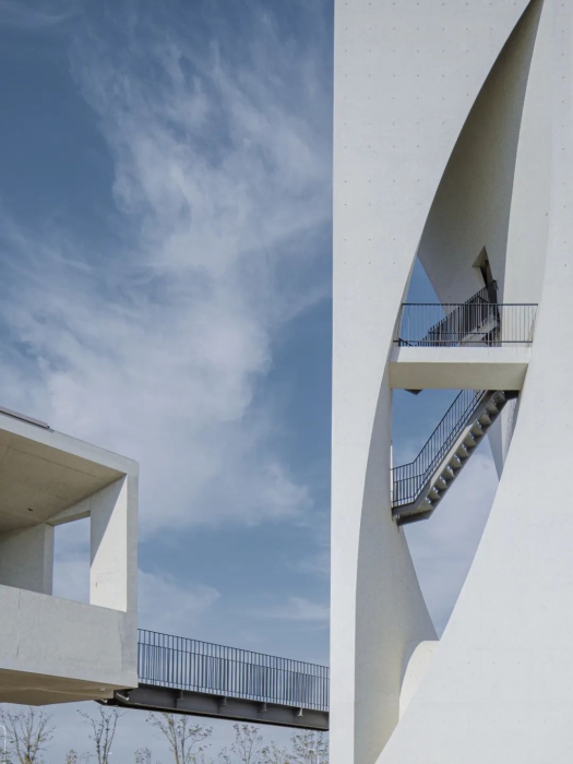 该项目虽小,技术表现力有限,但总要有表现。于是最终呈现的是不做装饰,尽量展露材料原貌——房子和塔保留了清混质感;桥的钢架构、主钢箱梁和渐变的肋板全部外露,不做封装,全部刷白。这样不仅降低了造价,其质朴柔和的气质与场地完全契合。
