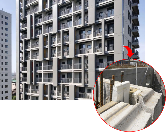 该项目17号楼主体结构采用装配整体式混凝土剪力墙结构,在外围护系统中研发了预制夹心保温系统、外窗系统的连接构造。室内全部采用装配式内装修,装配式架空地面系统、装配式隔墙系统并结合了热回收新风系统和厨房送排风系统。