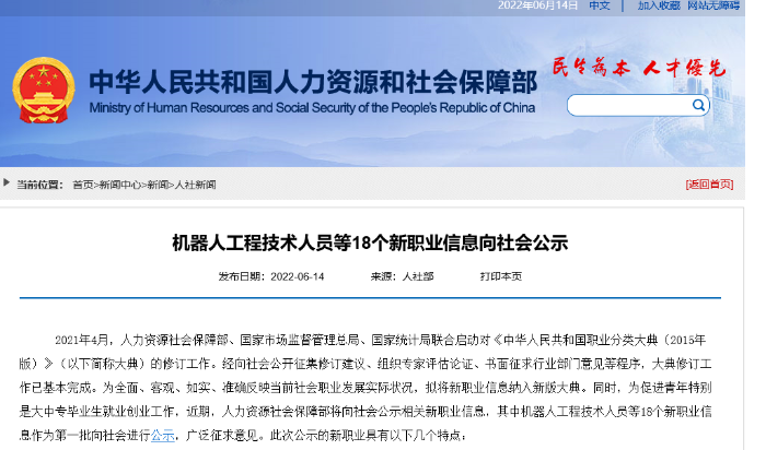 6月14日,人力资源和社会保障部官网发布《机器人工程技术人员等18个新职业信息向社会公示》,公示全文如下: