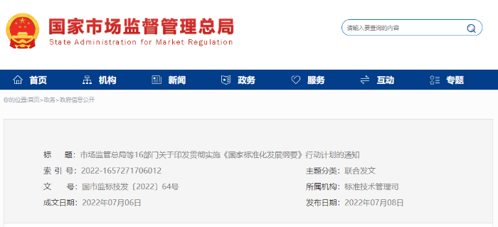 国家发展改革委、市场监管总局、中央网信办、科技部、工业和信息化部、公安部、民政部、住房城乡建设部、交通运输部、农业农村部、商务部、卫生健康委、应急部、人民银行、国务院国资委、全国工商联16部门联合发布《贯彻实施〈国家标准化发展纲要〉行动计划》。