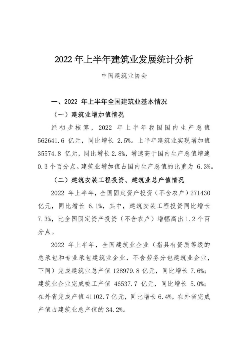 日前,中国建筑业协会发布《2022年上半年建筑业发展统计分析》。统计显示,上半年建筑业实现增加值35574.8亿元,同比增长2.8%,增速高于国内生产总值增速0.3个百分点;江苏、浙江继续领跑全国各地区建筑业,建筑业总产值双双超过1万亿元。