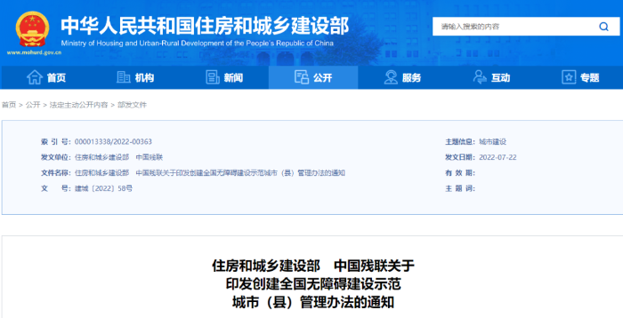 为规范开展全国无障碍建设示范城市(县)创建活动,住房和城乡建设部、中国残联印发《创建全国无障碍建设示范城市(县)管理办法》。