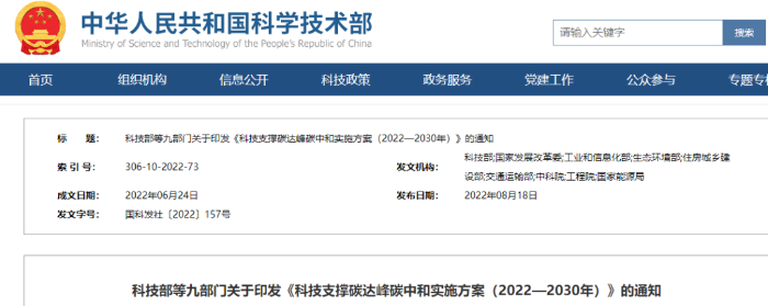 为深入落实党中央、国务院有关部署,做好科技支撑碳达峰碳中和工作,近日,科技部等九部门联合印发《科技支撑碳达峰碳中和实施方案(2022—2030年)》(以下简称《实施方案》),统筹提出支撑2030年前实现碳达峰目标的科技创新行动和保障举措,并为2060年前实现碳中和目标做好技术研发储备,指导全国科技界以及相关行业、领域、地方和企业开展碳达峰碳中和科技创新工作。