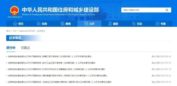 近日,住房和城乡建设部办公厅就国家标准《民爆工程术语标准》《电子工业工程术语标准》《石油天然气站内工艺管道施工标准》《隔热耐磨衬里技术规范》《石油化工设计能耗计算标准》公开征求意见,意见反馈截止时间为2022年9月10日。